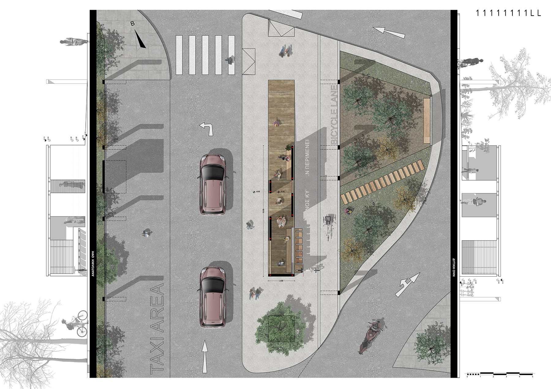The design of the covered waiting area addresses the dual nature of the project: time and space. Space is understood as the intermittent area that forms the necessary predicament in order to communicate with the surrounding area, which stands in the center of the design as the main source of inspiration. Time is understood through its temporary nature on the journey of the subject and there is value assigned to the otherwise “blank” waiting time.