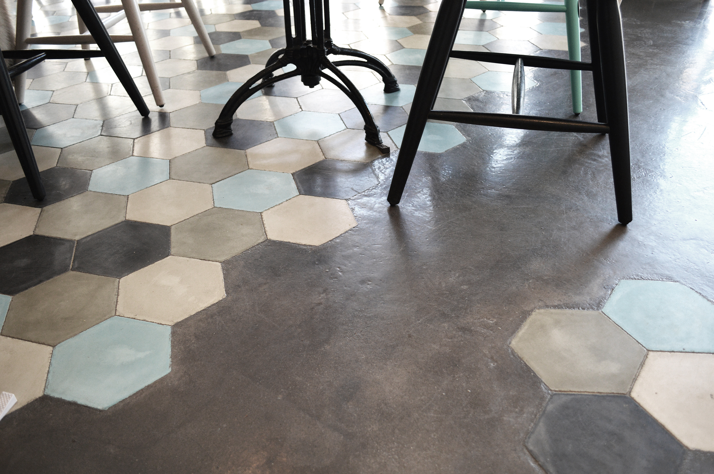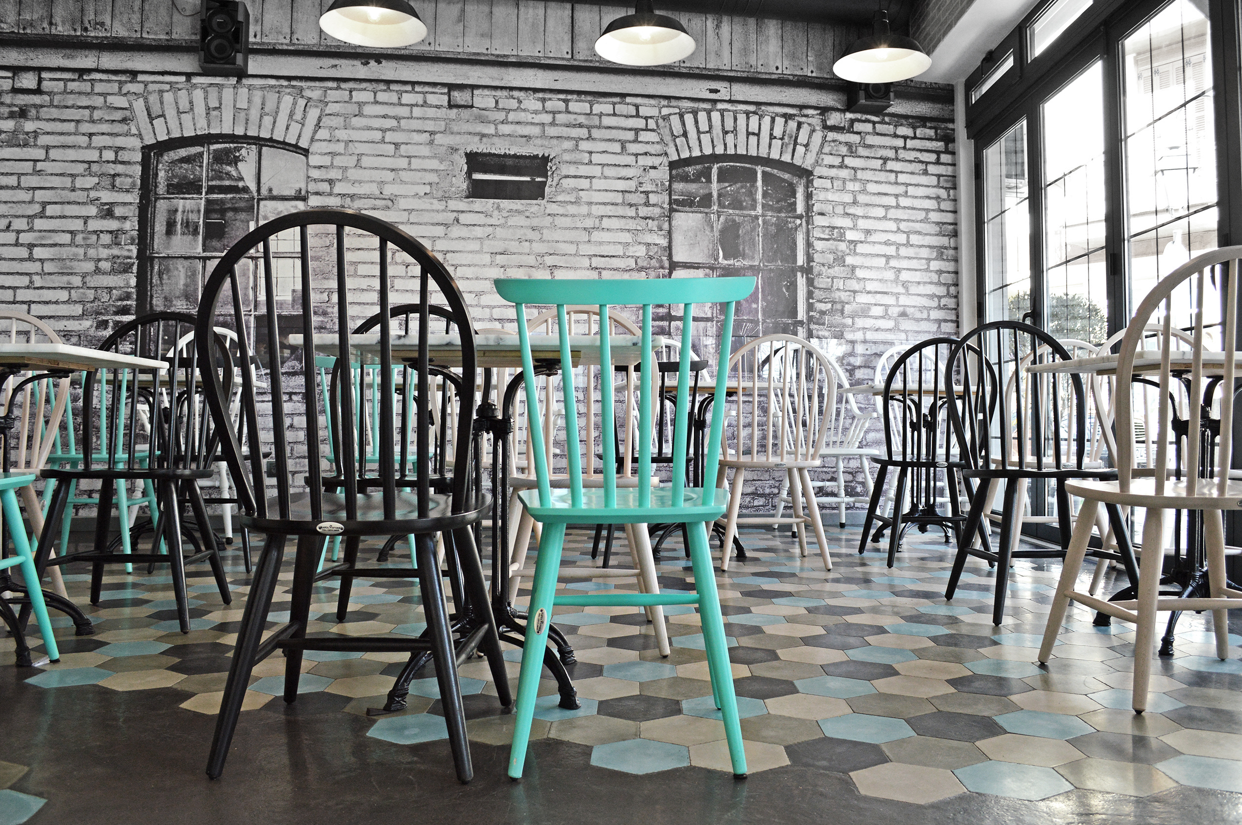 The use of neutral tones is balanced by vibrant accents, such as the geometric, patterned tiled floor complemented by turquoise chairs, creating a playful contrast. The choice of furniture—simple, white and black wooden chairs—complements the brickwork and adds to the tavern’s welcoming atmosphere. Pendant lighting, in matte black finish, adds an industrial touch while providing warm, intimate lighting.