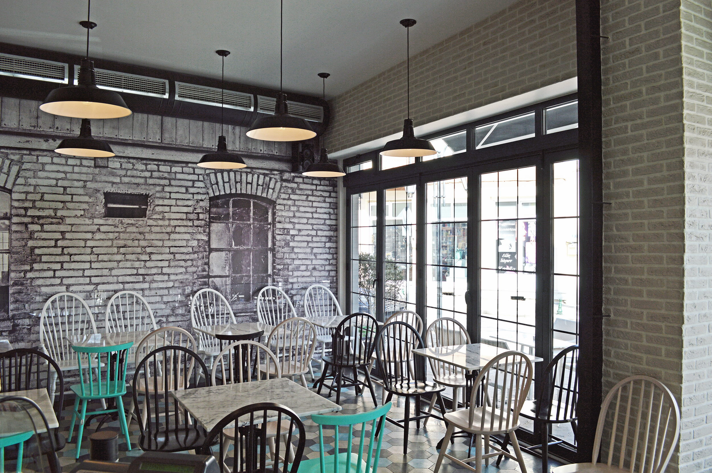 The design of the Oasi Food Bar, blends modern industrial aesthetics with a rustic, cozy ambiance. On the inside, exposed brick walls create a textured backdrop, evoking a sense of traditional craftsmanship. A large mural depicting an old brick structure adds depth to the space, enhancing its vintage charm.